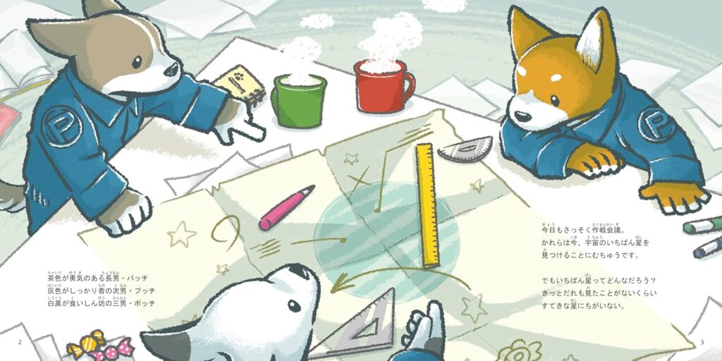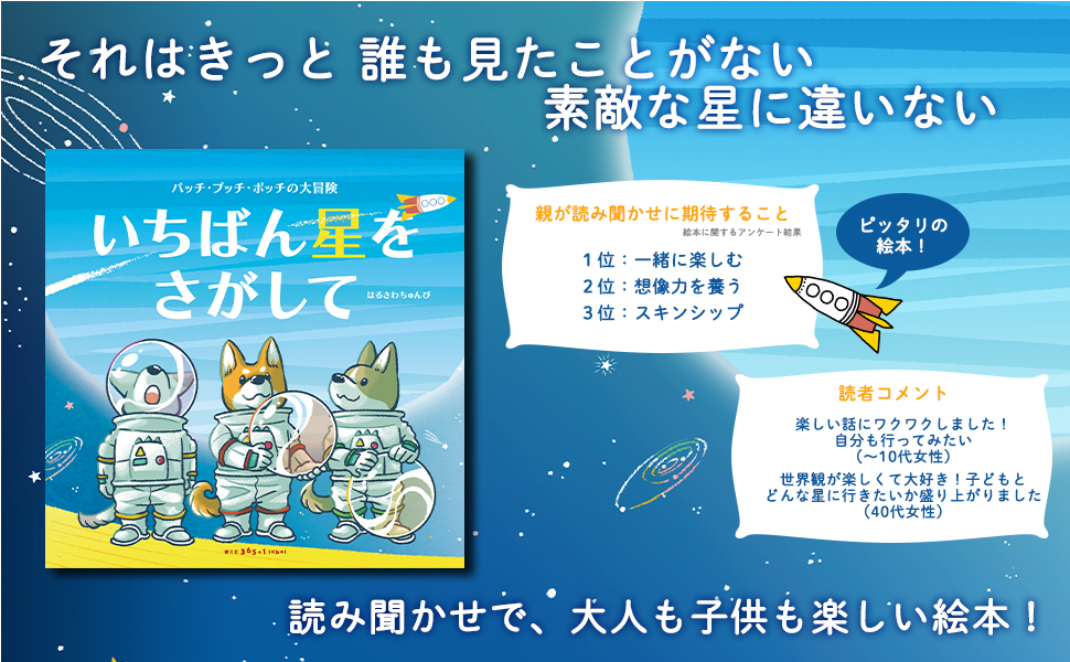 大冒険が大好きなわんこ3兄弟。誰も見たことがないくらい素敵な星「いちばん星」を探しに彼らは宇宙へ飛び出します。色んな星を訪れて、3匹が最後に訪れたのは??