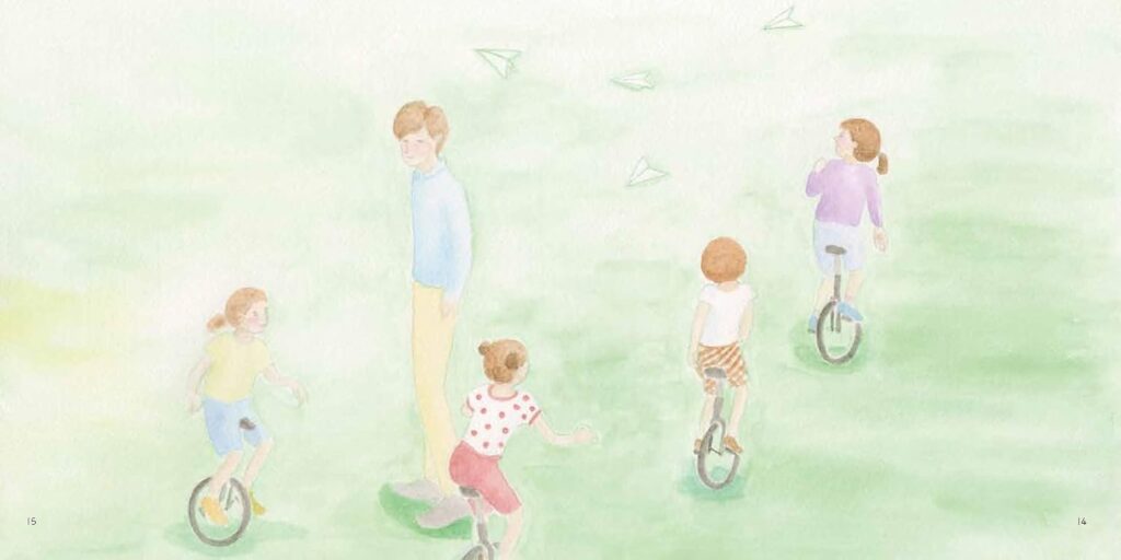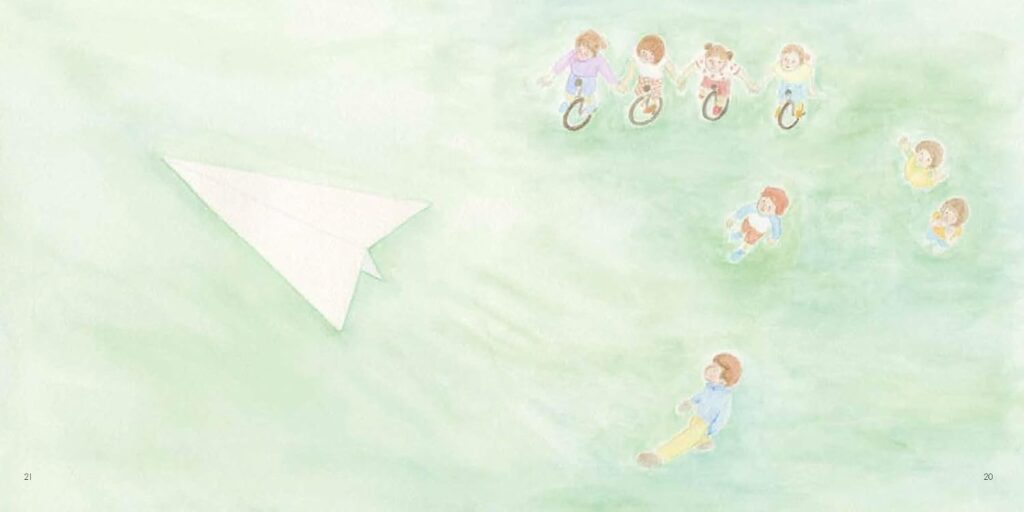 「さっき公園で見かけ人、頭に紙飛行機当てられてたな……」って微笑みながら思い出してほしい場面を、言葉を使わずに絵だけで描いた絵本です。